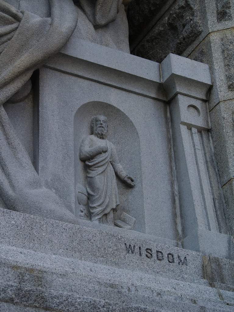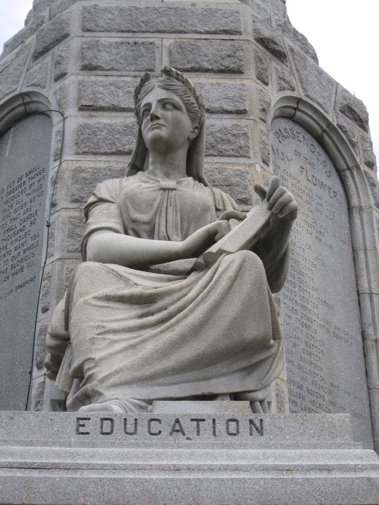 The statue of Education is holding an open book of knowledge (the Bible) implying its truth must be passed to all. Flanking her throne are two carved reliefs; one is Youth (the object of the parents instruction) and the other Wisdom (represented by a grandfather) pointing to the commands and an open Bible, with the world at his feet. The family, both parents and grandparents, were to teach the youth how the world works from a Biblical perspective. Education is wearing a wreath of victory, which is obtained when children are well-instructed in the Lord.