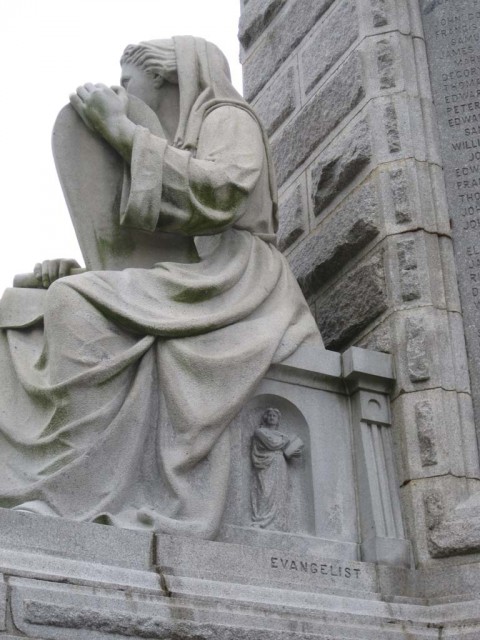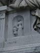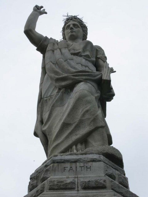 The monument is composed of numerous statues; the most prominent is Faith, standing with one hand pointed to the heavens and the other holding a Bible. At the base of the pedestal where Faith stands are four seated statues representing Morality, Law, Education, and Liberty. Flanking these allegorical figures are smaller engravings representing more components of the template of liberty.